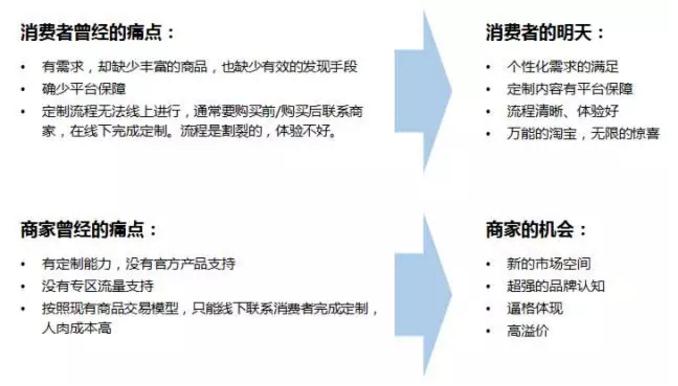 在这个崇尚个性化的时代,消费者在购物过程中存在大量的个性化需求,例如:DIY一款T恤、定制一款首饰、送礼物时定制一个包装礼盒……在众多的“标品”中,定制商品一直占有一席之地。