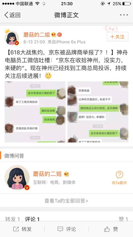 另外,此前微博用户“蘑菇的二姐”发布的关于神州举报京东的微博也已删除。