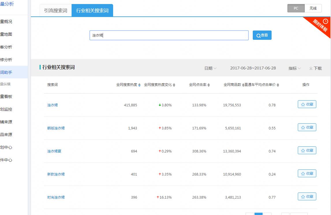 如上图我们可以直接搜索我们的行业相关词,然后我们就会看到一些行业相关搜索词的全网搜索热度、全网搜索热度变化、全网点击率、全网商品数、直通车平均点击单价。这边我们可以收藏二十个以上的搜索词来进行比对,可能还有人说之前可以用生e经来查看整个行业数据,现在是找不到或者用不了了。这边表示不太清楚,可能是系统屏蔽了。(看数据的时候也可以比对下属性尤其是潜力属性)