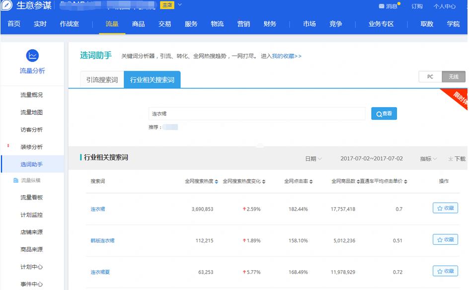 通过这些找到系统推荐的热词,我们还可以拓展更多词。我们通过生意参谋流量分析中的选词助手可以找出这些词的相关词,并且可以查到这词近7天的相关行业数据,见图6;