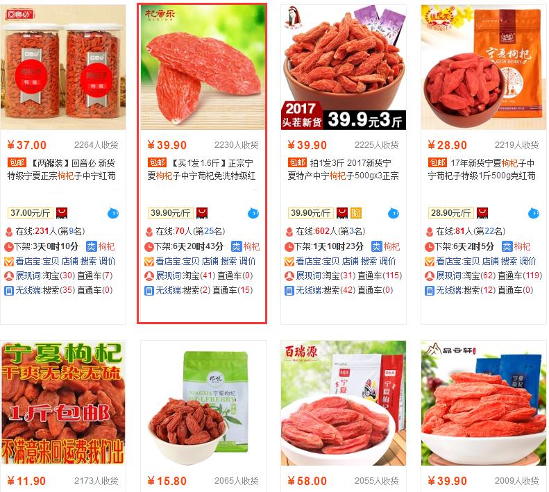 那接下来我再举个例子:去搜索一下枸杞这个产品,基本都是右下角这样的风格的主图,那么买家都是会走马观花的去浏览网页。而这个时候,是不是如图下的红色框的主图比较有创意一点呢?先不说是否有美感,起码可以在第一时间抓住买家的眼球,从而大家可以看待,这个店铺的销量也是很不错的。